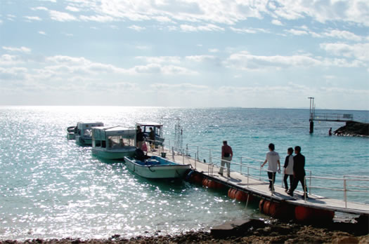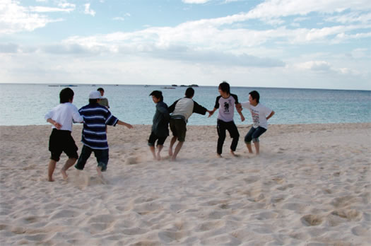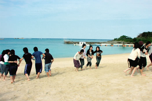 グラスボートでサンゴ礁の少し深いところにすむ生きものを観察するプログラムと、サンゴ礁の真っ白い砂浜で裸足になり五感を使ってコミュニケーション力を高めるゲームとのセットプログラムです。