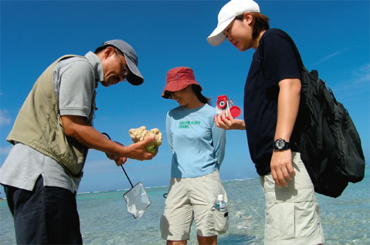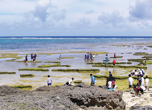 リーフトレイルでは、潮の引いた時間帯に出現するサンゴ礁の大地を歩きながら、そこにすむ生きものをじっくり観察します。