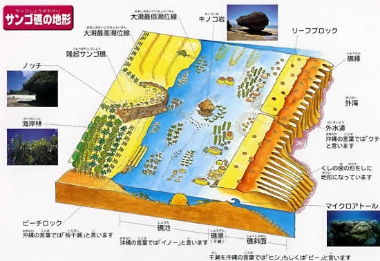 沖縄の島々の周りには美しいサンゴ礁が広がっています。ネイチャーワークスのホームグラウンドである読谷村の海岸は、そのほとんどが整備されていない自然海岸であり、典型的なサンゴ礁地形の特徴を持っています。